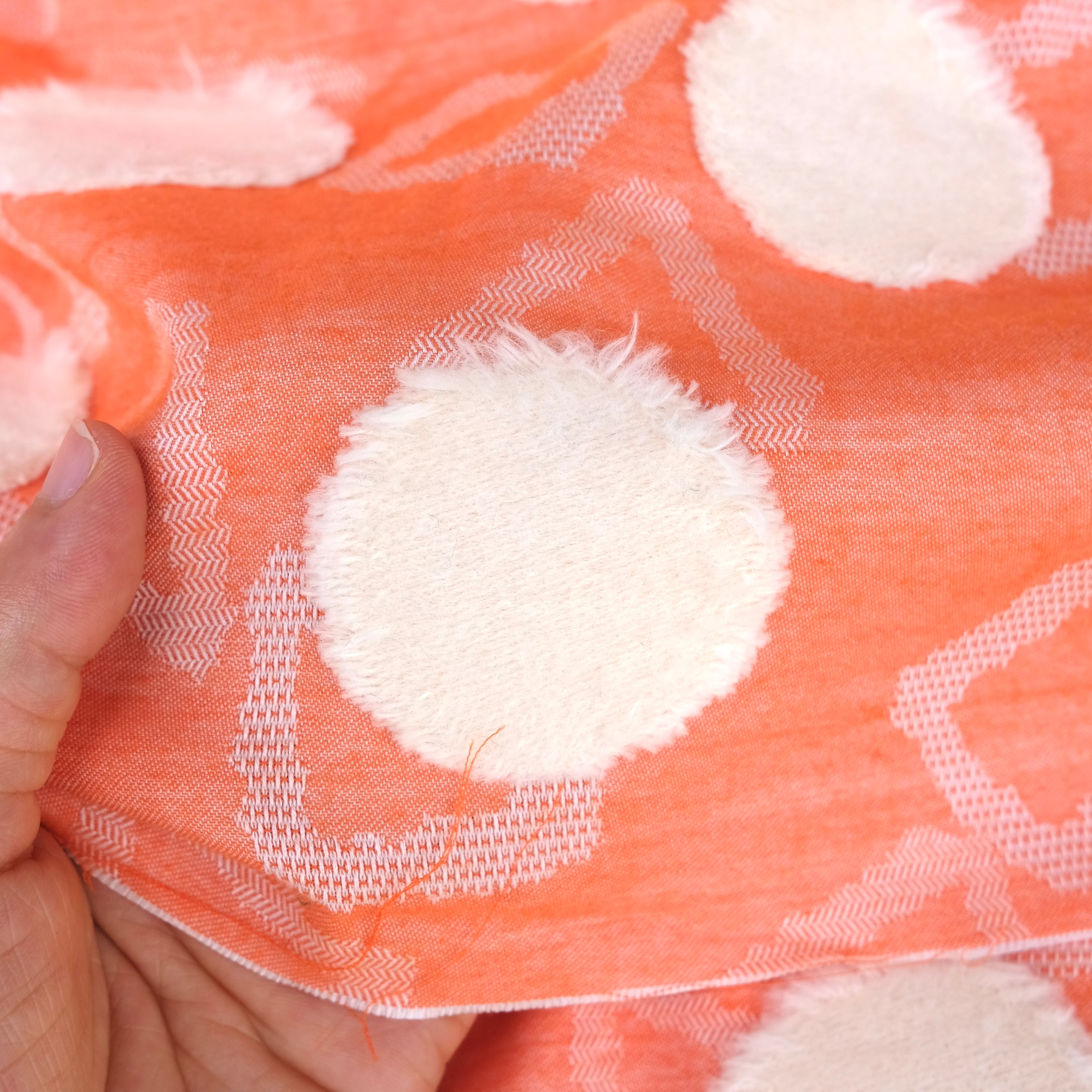 直径5cmほどのドット部分には太い緯糸を使用し、起毛加工を施しているため、見た目以上にふんわりとした質感を楽しんでいただけます。